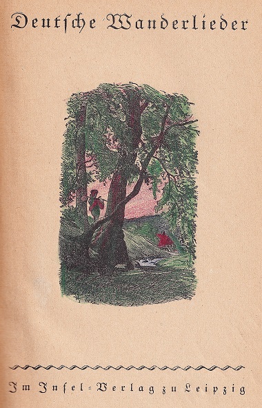 Von privat kolorierter Titelholzschnitt gefunden in Deutsche Wanderlieder. Insel-Bücherei Nr. 313Leipzig 1920. 1. - 10. Tsd.