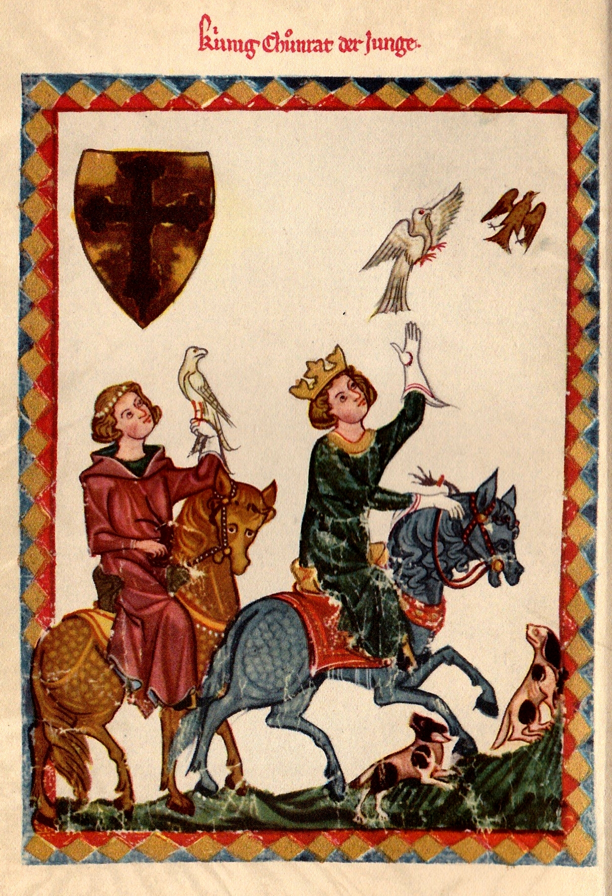König Konrad der Junge (Konradin) Tafel 2aus Die Minnesinger in Bildern der Manessischen Handschrift Insel-Bücherei Nr. 450Leipzig 1933. 1. - 132. Tsd.