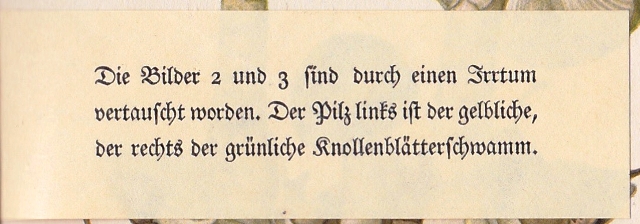 Korrekturzettel zur Verwechslung der Tafeln in IB 503(1A)/01/2 Das kleine Pilzbuch. 1.-47. Tsd. 1937